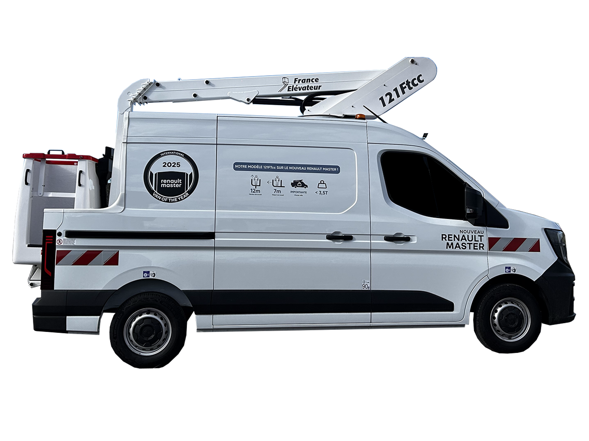 The first machine that sorted out of the FE workshop was a "12 m platform on a CITROËN van", today this product is available on all RENAULT Master, IVECO Daily, MERCEDES Sprinter and FORD Transit utility vans.